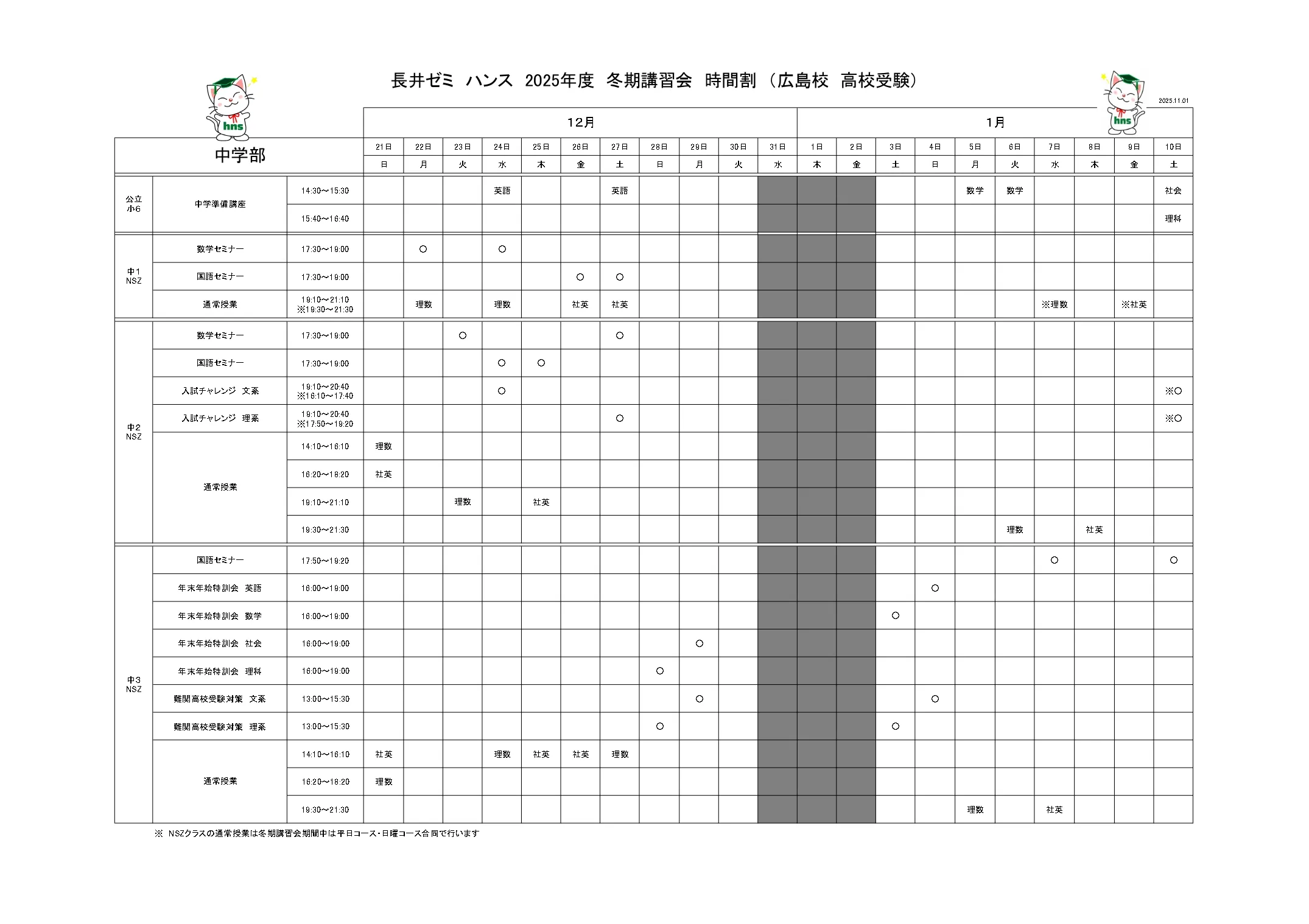 | 中3 | 公立高校受験/NSZ | 冬休み以降の先取り(英・数・理・社) |