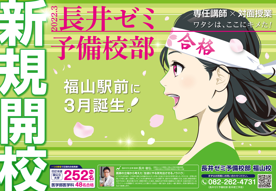 予備校部福山校の詳細は、後日発表となります。 お問い合わせは、 長井ゼミ予備校部 082-262-4731 担当:斉野平 まで、宜しくお願い致します。