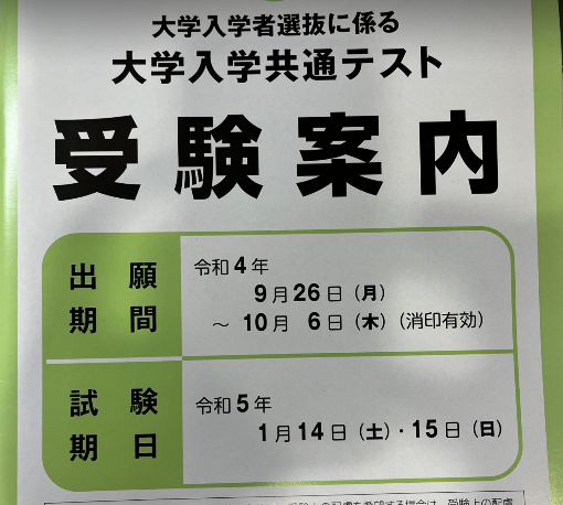共通テスト出願が今月から始まります。9/26~10/6消印有効です。
