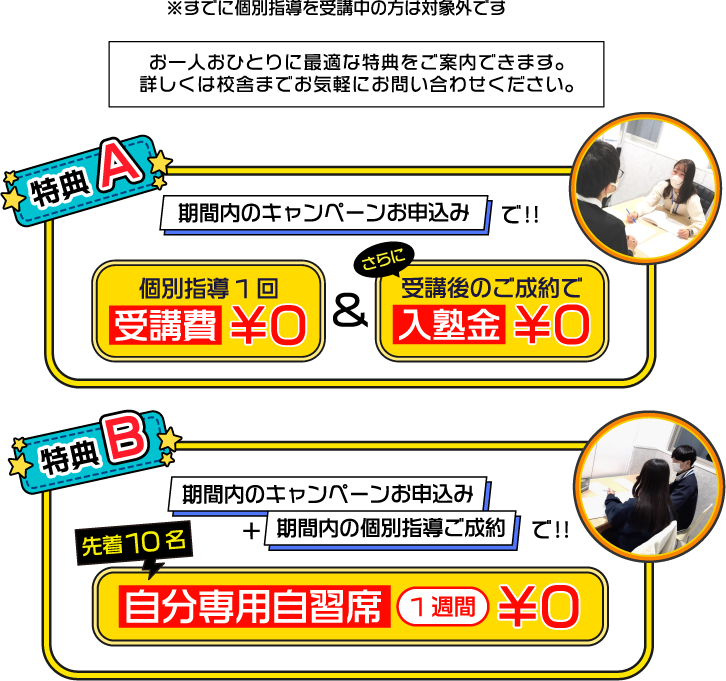 特典A 〈期間内のお申込み〉で・・・ ●個別指導1回が無料で体験受講可 ●体験後のご成約で入塾金無料 特典B【先着10名!】 〈期間内のお申込み〉+〈期間内の個別指導ご成約〉で・・・ ●お申込み日から1週間、自分専用自習席が無料で利用可能 |